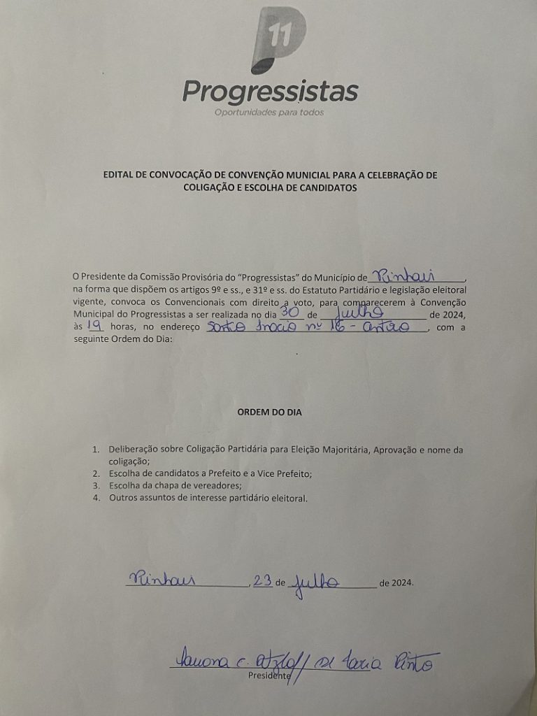 O Presidente da Comissão Provisória do “Progressistas” do Municipio de Pinhais na forma que dispõem os artigos 9º e ss., e 31º ess. do Estatuto Partidário e legislação eleitoral vigente, convoca os Convencionais com direito a voto, para comparecerem à Convenção municipal do Progressistas a ser realizada no dia 30 de Julho de 2024, as 19 horas, no endereço Santo Inacio nº 16 – Centro com a Seguinte Ordem do dia: