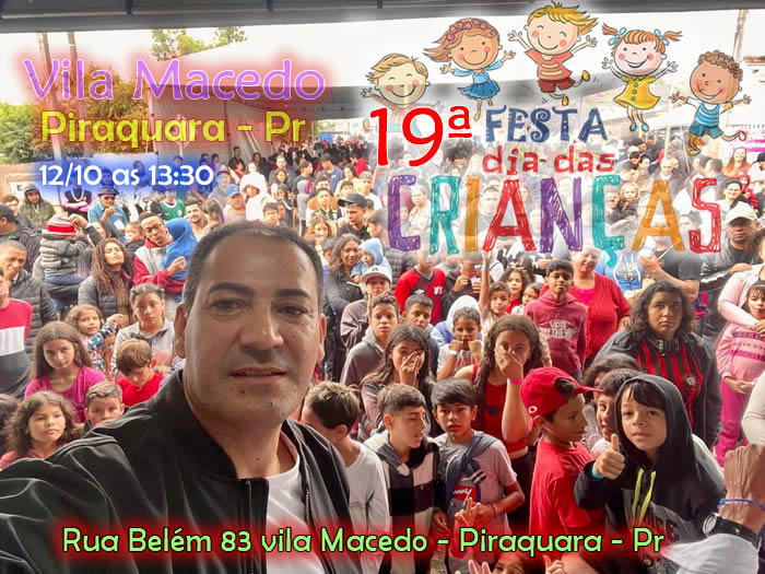 A comunidade convida a todos para participarem das diversas atrações no próximo dia 12 de outubro, a partir das 13:30h da 19ª Edição da Festa do dia das Crianças,